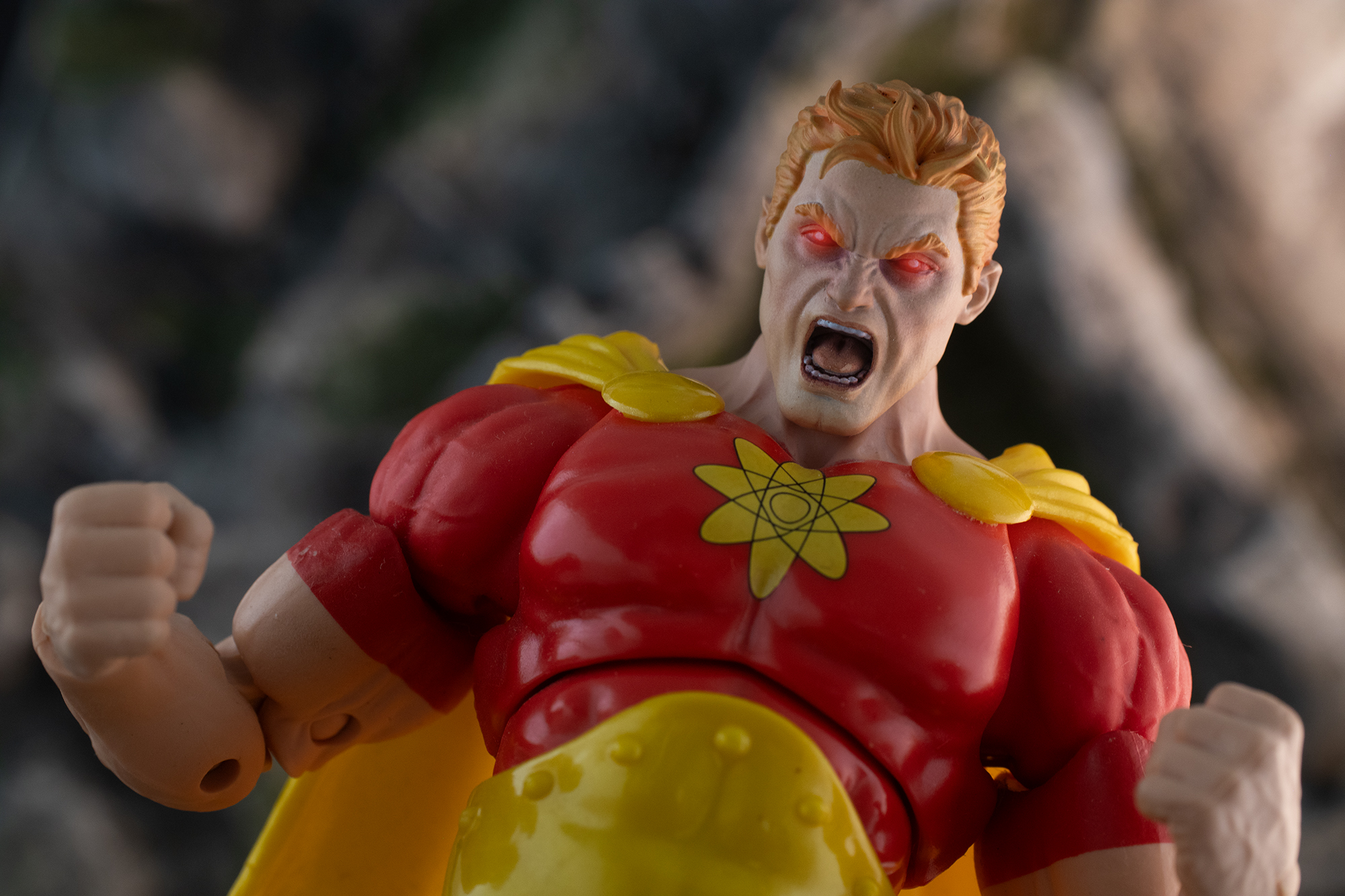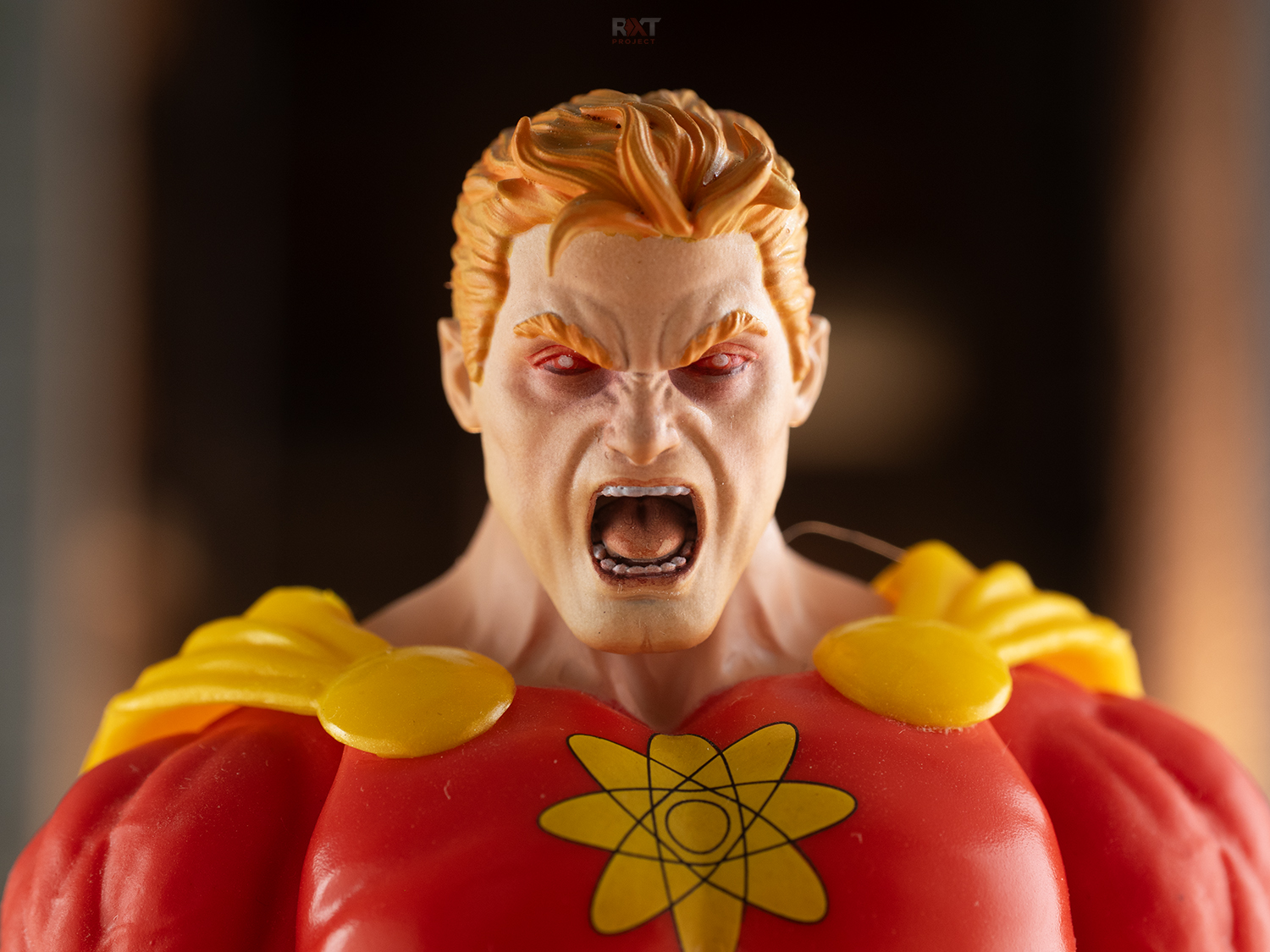 The combination of the bright red armor, atomic emblem, and custom head sculpt creates a striking visual that captures Hyperion at his most powerful moment. This sculpt doesn’t just add realism; it elevates the entire figure, making it feel like a moment pulled straight out of a comic panel.