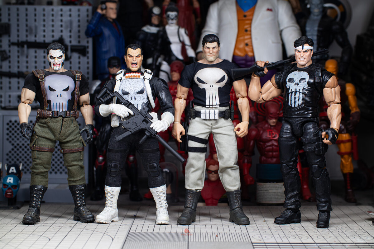 When placed next to other popular 1/12 figures, the differences are easy to spot, from left to right are Kitbash Punisher using GW Toys blank body, Mezco Punisher (Spec Ops), Kraken Studio Crime Buster, and Marvel Legends Punisher (with Motorcycle). Crime Buster appears slightly taller and bulkier but still blends well with other 1/12 scale figures and doesn’t feel out of place.
