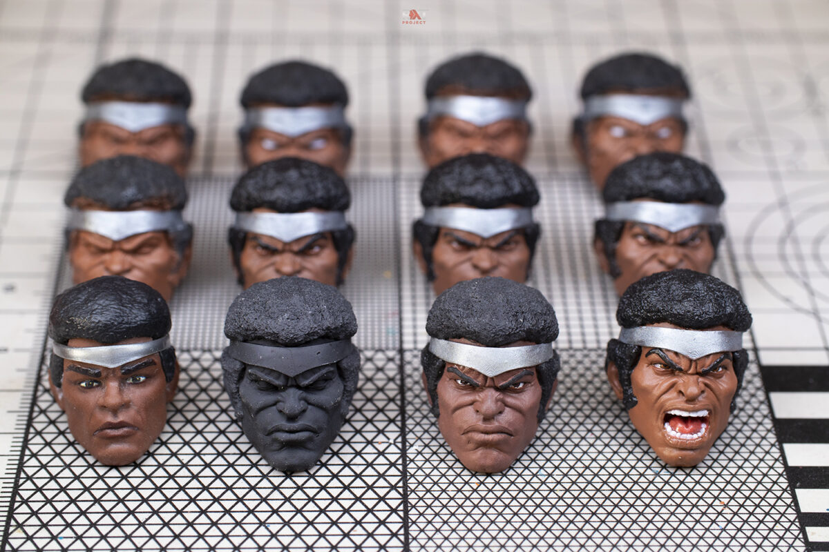 A custom head sculpt collection featuring multiple facial expressions, crafted for action figure collectors with attention to emotion and paint detailing.